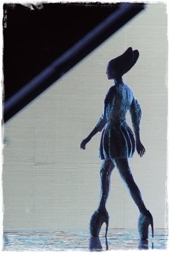 Assim tem início o desfile da coleção Primavera 2010 de Alexander McQueen, que tem como tema a lenda de Atlântida contada nos dias atuais.