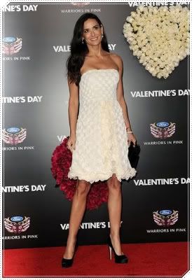 Julia Roberts (Uma Linda Mulher) estava simples e elegante com vestido preto de organza e sandálias prata. Já sua sobrinha, a também atriz Emma Roberts (Aquamarine), mostrou seu senso fashion. Com um mini vestido creme atado ao pescoço, muito apropriado para sua idade, Emma brilhou ao lado da tia. Apesar de não fazer parte do elenco de Valentine's Day, Demi Moore (Desconstruindo Harry) não poderia perder a premiere. Afinal, seu marido Ashton Kutcher (Jogo de Amor em Las Vegas) é um dos astros do filme. Ela estava bastante elegante e sutil em seu vestido branco Chanel com trabalho em quadriculado. O vestido é da coleção de Alta-Costura - Primavera 2009. Jóias também Chanel.
