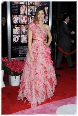 Jessica Alba (Sin City) estava usando um mini vestido esmeralda com plumas e pequenas jóias incrustadas e sandálias meia-pata. A xará Jessica Biel (Tudo Acontece em Elizabethtown) chegou na premiere com um vestido de chiffon longo cor-de-rosa, cheio de camadas, Oscar de la Renta. Maquiagem nude nos