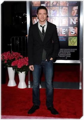 Topher Grace (Homem-Aranha 3), muito confortável em sua combinação despojada de terno chumbo, pulover cinza, e calça jeans.