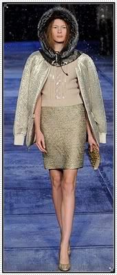 Não, não, não: blusa de pele com saia tubo e paletó com brilho. Jaqueta com brilho e capuz de pele. Legging florida.
